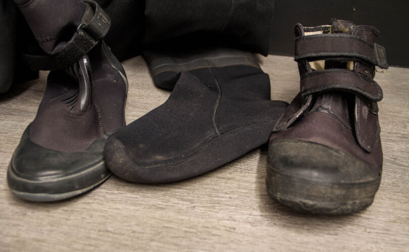 Auch bekannt unter Boots, Flexboots und vielen weiteren Namen. Sie sind fest angesetzte Schuhe, oft aus Neopren, mit einer Sohle, die für die meisten Tauchplätze geeignet sind.