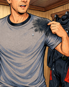 Ein generell gutes Hilfsmittel ist graue Kleidung aus Baumwolle, da sie sich bei Nässe sichtbar dunkel verfärbt und auch die Flussrichtung andeutet. Ist beispielsweise des Kragen des Shirts komplett nass und der Fleck zeigt in Richtung Körpermitte (Bild 1), wird der Fehler im Bereich der Manschette liegen .