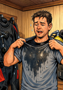 Mit einem Trockentauchanzug kommt früher oder später der Tag, an dem man nach einem Tauchgang stellenweise nass geworden ist. In vielen Fällen fängt dies ganz harmlos und kaum warnehmbar an und wird in diesem Stadium oft für Schweiß oder Schwitzwasser gehalten, was auch durchaus der Fall sein kann. Mit der Zeit werden die Leckagen i.d.R. zunehmend größer. Man spürt noch kein einströmendes Wasser, stellt beim Ausziehen aber immer größere nasse Stellen am Unterzieher und der Kleidung fest. Einige Ursachen kann man (ausdrücklich nur mit entsprechenden Sicherheitsvorkehrungen gegen Unterkühlung und eine eventuelle Beeinträchtigung der Tarierung) leicht selbst herausfinden und abstellen, bei anderen sollte man sich an eine Fachwerkstatt wenden.