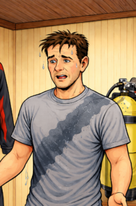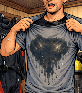Beginnt der nasse Fleck relativ mittig, auf der Brust und der Kragen ist weitestgehend trocken (Bild 2), hat die Verschraubung des Ventils oder die O-Ringe im Inneren nicht mehr dicht gehalten. Im Falle der O-Ringe empfehle ich ebenfalls einen Austausch des kompletten Ventils, weil ich selbst schon die Erfahrung gemacht habe, dass der Spuk nach wenigen Tauchgängen von vorne los gehen kann.